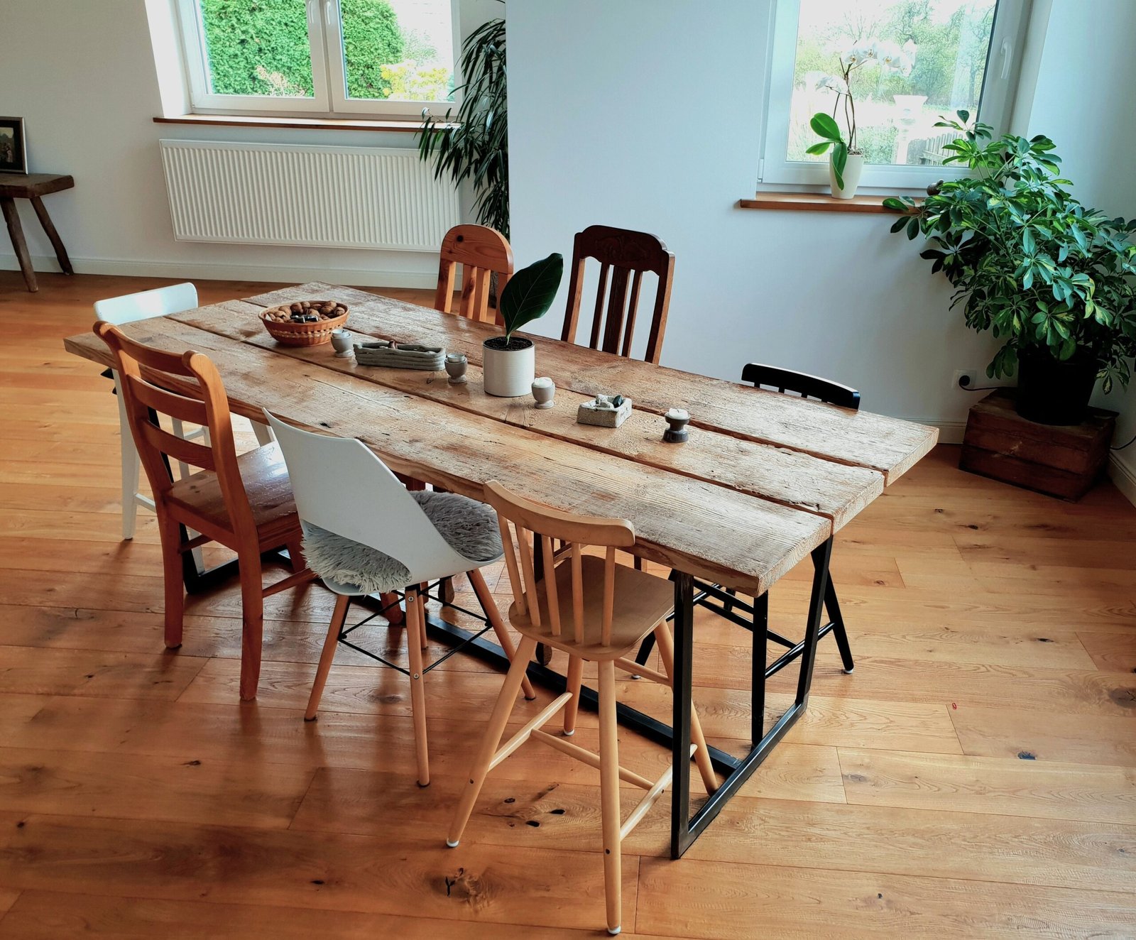 Kombination von Bohlentischen aus Altholz mit verschiedenen Einrichtungsstilen